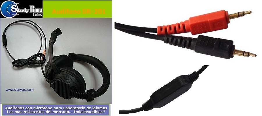 - Conector de dos plug stereo de 3.5mm tipo TRS, uno para el audífono y otro para el micrófono.