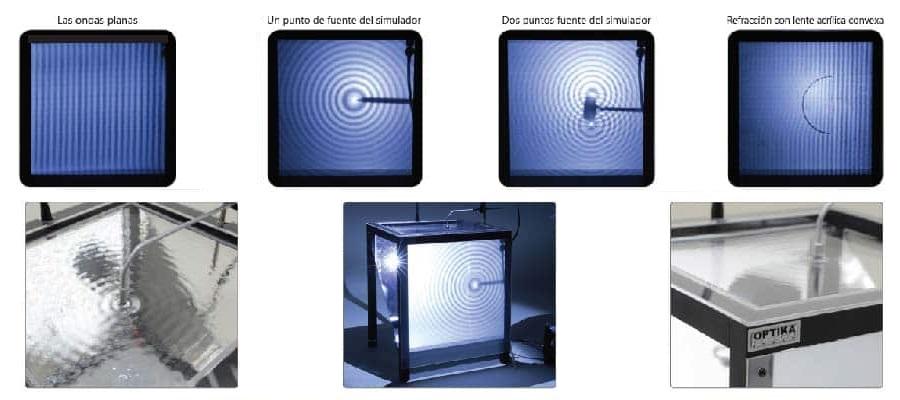 Cubeta que se llena con agua, en la que un vibrador electrodinámico genera ondas.