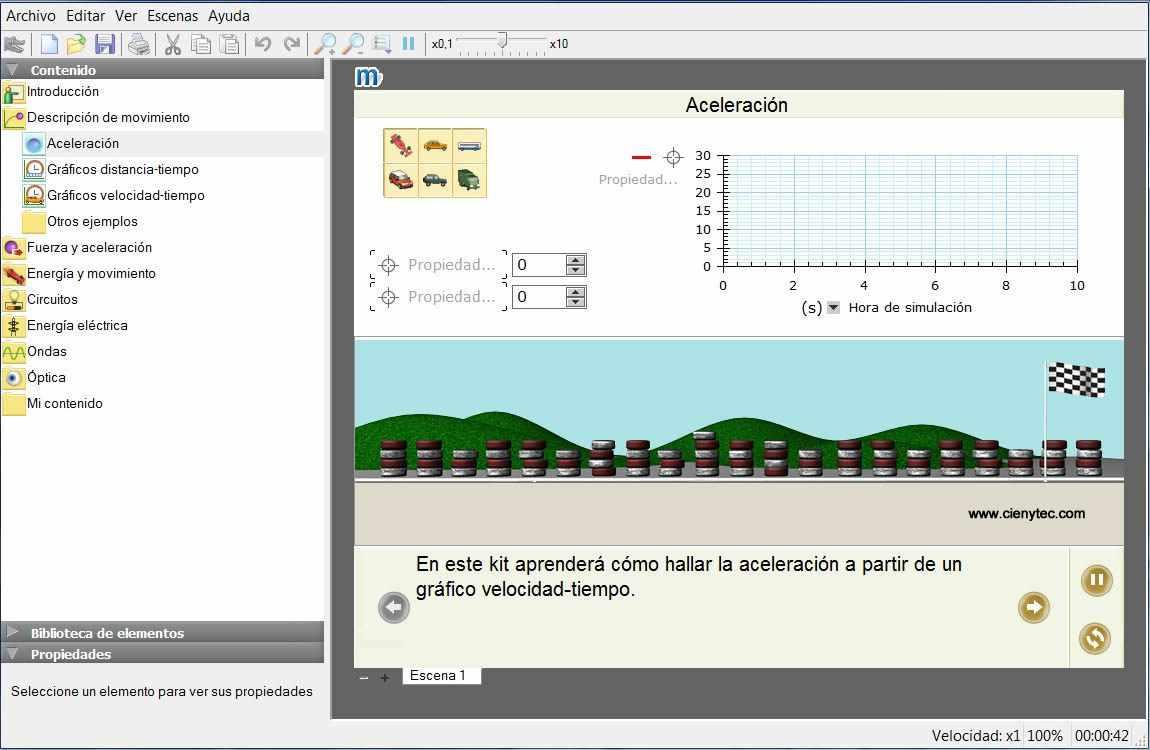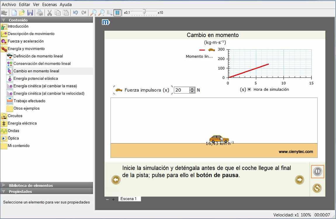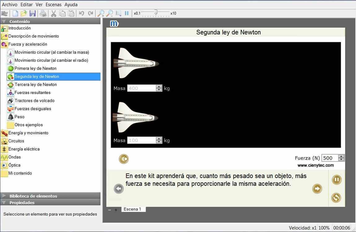Para estudiar movimientos y fuerza permite experimentar con carros, bloques, muelles y pelotas, controlando la fricción, la elasticidad y la gravedad.