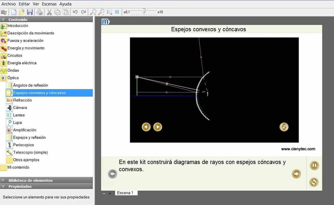 Se pueden observar también fenómenos como la reflexión, refracción, difracción e interferencias. Permite simular experimentos con fuentes de luz, lentes, prismas y espejos. Permite trabajar con imágenes de objetos reales y se realizan experimentos de amplificación, lupas, cámaras, periscopios, telescopios, etc. Leer más