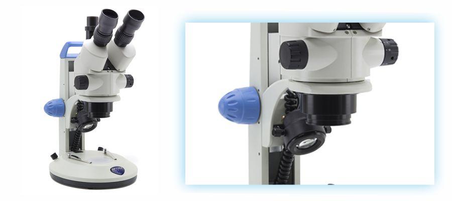 Serie de estereo Microscopios LAB, binoculares y trinoculares, con opciones de 20x-40x y estereozoom desde 7x hasta 45x de graduación continua.